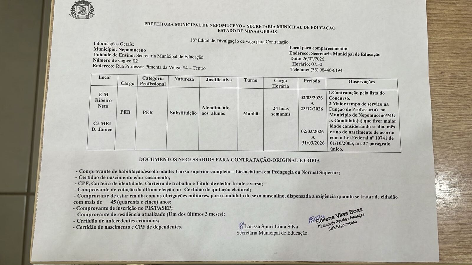 A Secretaria Municipal de Educação de Nepomuceno/MG, no uso de suas atribuições legais,