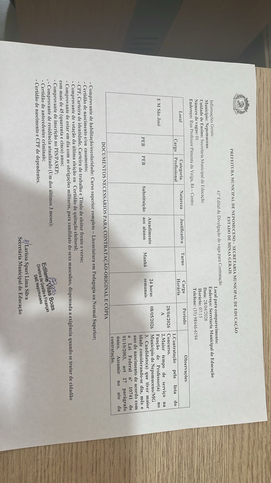 • Local para comparecimento: Diretoria da Secretaria Municipal de Educação