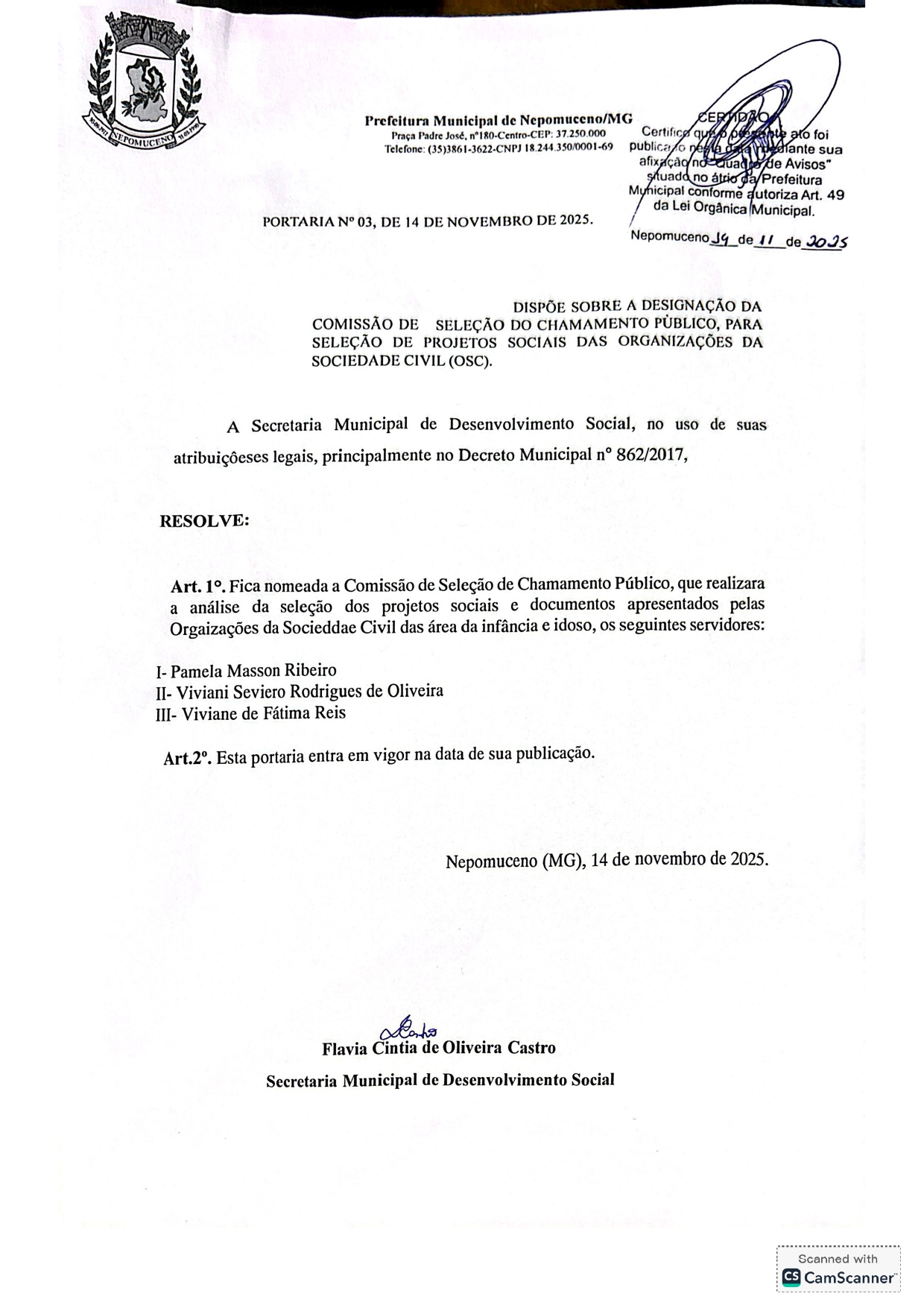 Art. 1º. Fica nomeada a Comissão de Seleção de Chamamento Público, que realizará a análise da seleção dos projetos sociais e documentos apresentados pelas Organizações da Sociedade Civil das área da infância e idoso, os seguintes servidores: